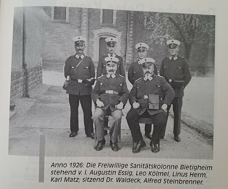 Bei einem Großbrand in der Alten Rathausstraße 5, am 14. Juli 1926, wurde ein Feuerwehrmann durch einen herabfallenden Kamin so schwer verletzt, dass er, da keine Hilfe geleistet werden konnte, verstarb. Daraufhin gründete sich die erste Freiwillige Sanitätskolonne Bietigheim. Mitglieder waren Dr. Waldeck, Albert Steinbrenner, Dionys Hartmann, Augustin Essig, Leo Kölmel, Karl Matz und Linus Herm.